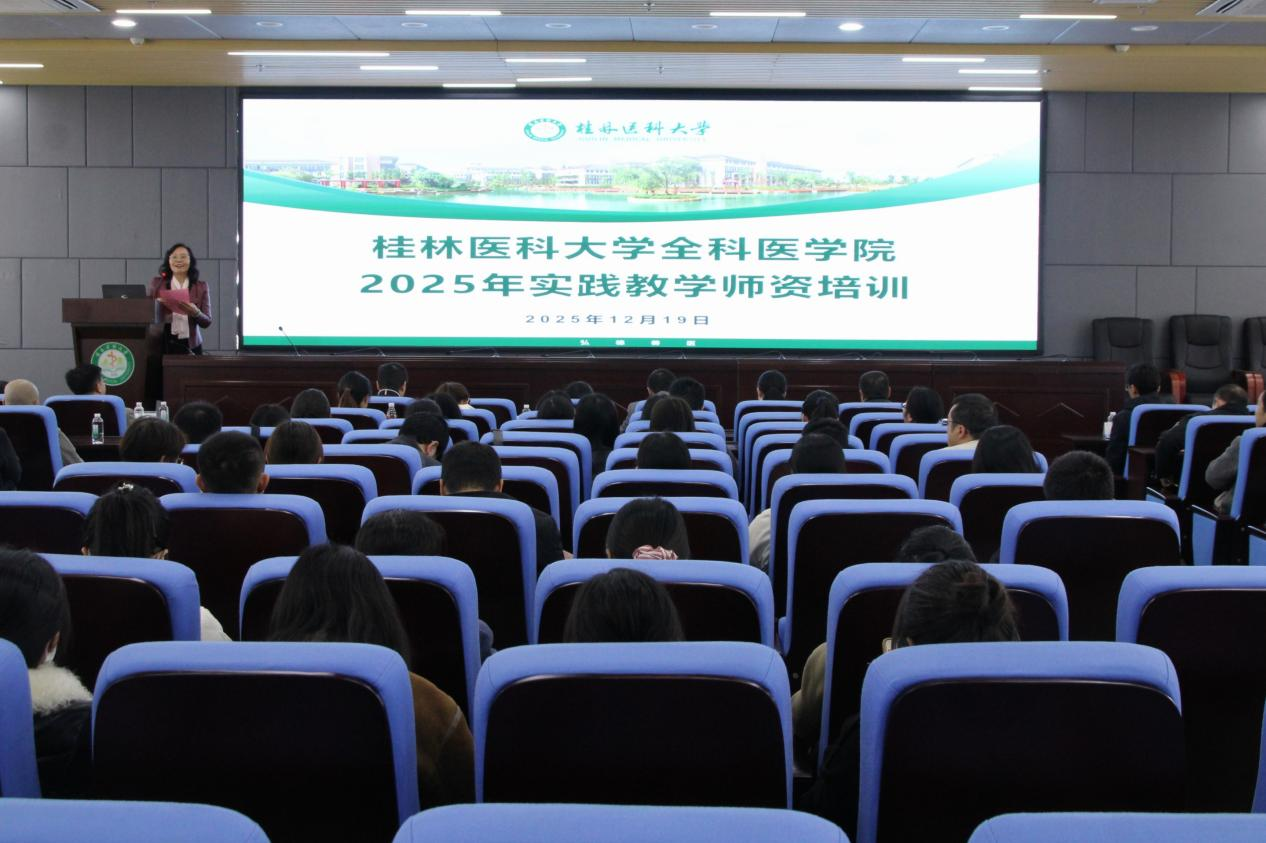 为深入推进全科医学实践教学高质量发展,加强基层卫生人才培养能力建设,2025年12月19日,全科医学院在临桂校区科学实验中心报告厅成功举办了“2025年度全科实践教学师资培训”。常务副院长袁晟光教授出席开班仪式并致辞,教研科科长唐建红教授主持培训活动,全院老师和来自各二级医院实践教学基地带教老师120余人参加培训。