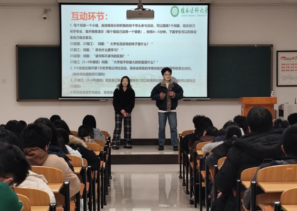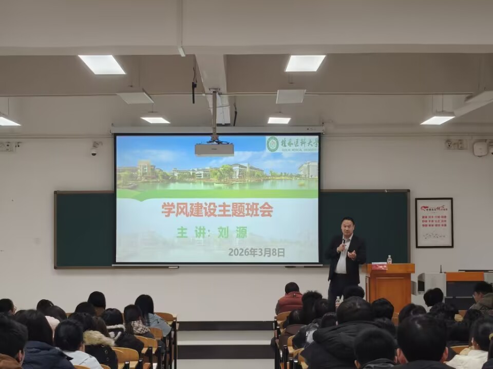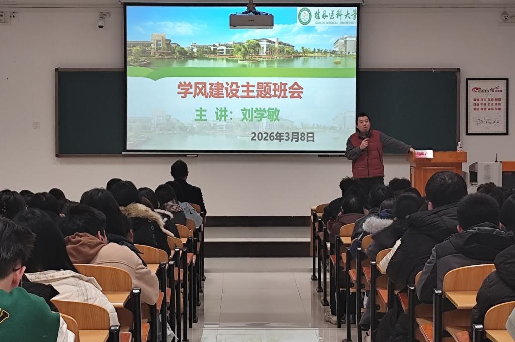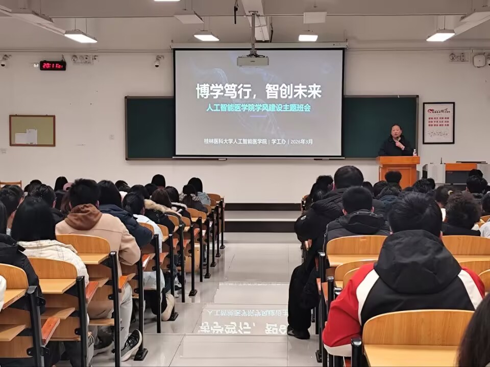 为深入实施新时代立德树人工程,营造勤学善思、笃行实干的优良学风,3月8日晚,人工智能医学院2023级智能医学工程等五个班级在临桂校区教学北楼403室联合举办学风建设主题班会。副院长刘源、班主任刘学敏及全体同学参会。班会由辅导员喜俊霞主持。