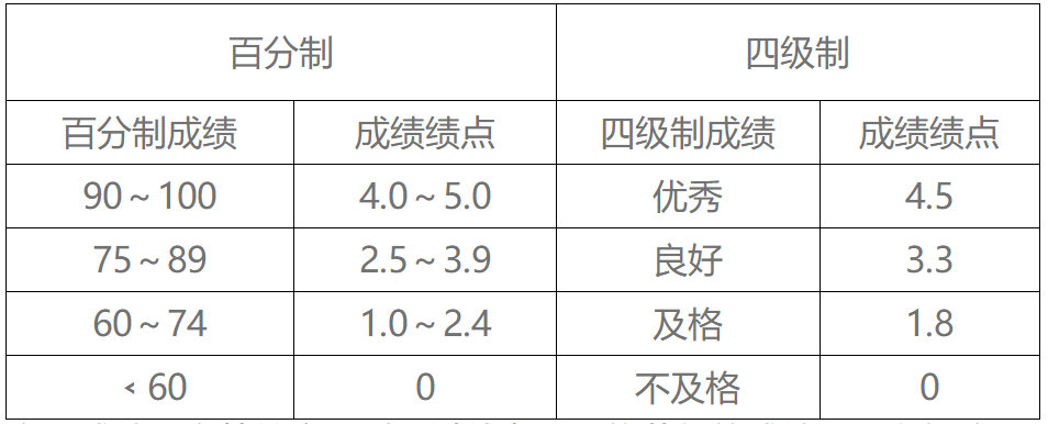 课程成绩所得绩点的计算公式为:绩点=[分数/10]-5。课程考核成绩百分制、四级制与绩点对应标准如下:
