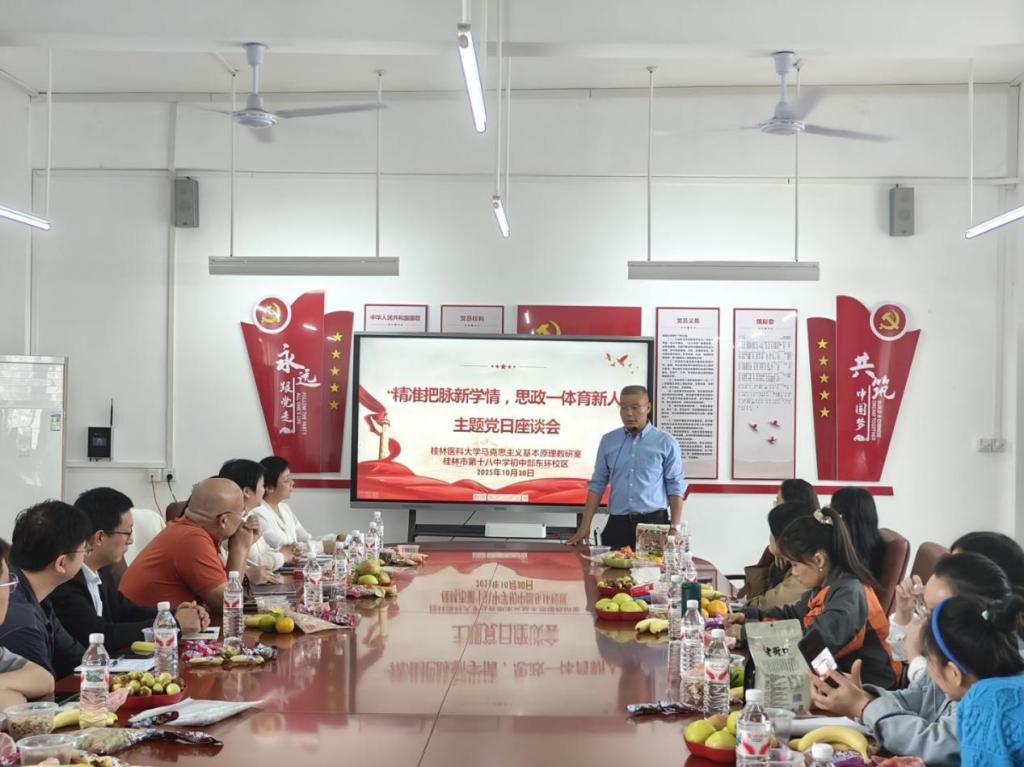 为深入贯彻落实习近平总书记关于“深入推进大中小学思想政治教育一体化建设”重要指示精神,10月30日下午,桂林医科大学马克思主义学院马克思主义基本原理教研室党支部赴桂林市第十八中学开展“精准把脉新学情思政一体育新人”主题党日活动。桂林市第十八中学初中部副校长刘越能、高中部党务办副主任陈友娟、初中部办公室副主任兼文科党支部书记王丽媛、文理科党支部、广西师范大学马克思主义学院实习生以及马克思主义基本原理教研室党支部参加活动。座谈会由桂林市第十八中学政治教研组组长甘丽丽老师主持。