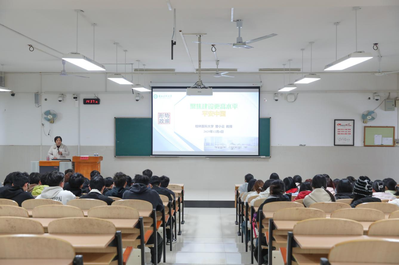 课堂上,曾小云结合医学院校立德树人与医疗卫生工作实际,深入解读“平安中国”与“健康中国”两大国家战略的时代背景与实践要求,紧密围绕坚定不移贯彻总体国家安全观,重点讲述了建设更高水平平安中国的重大意义、平安中国建设取得的显著成绩、建设更高水平平安中国的系统部署,通过详实的数据与鲜活的案例,引导学生深入理解平安中国建设所彰显的政党优势、制度优势、发展优势、治理优势。