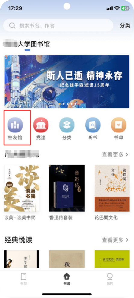 图书馆线上书城搭建校友馆专属书城,特设职场阅读专区,陪伴校友终身成长。