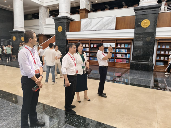 为帮助校友与嘉宾更好地了解图书馆的发展变迁,图书馆提前组建师生专业讲解团,为大家细致讲解馆藏资源布局、设施升级成果及校园文化内涵,从老旧书架的历史故事到智能借阅系统的便捷应用,每一处细节都勾起校友对求学时光的回忆。