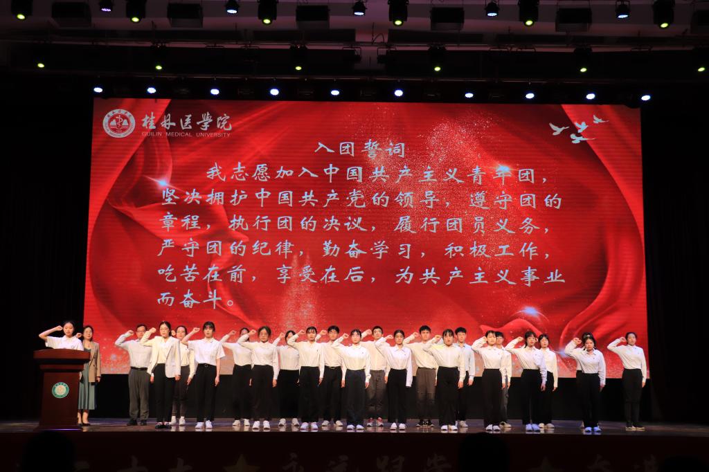 晚会上举行了庄严的入团、离团仪式,重温入团誓词,树立共青团员的光荣感和责任感,增强为共产主义奋斗的信念;并对桂林医学院“优秀共青团组织”“优秀共青团干部”“优秀共青团员”、2022年“桂林医学院青年五四奖章”进行表彰。