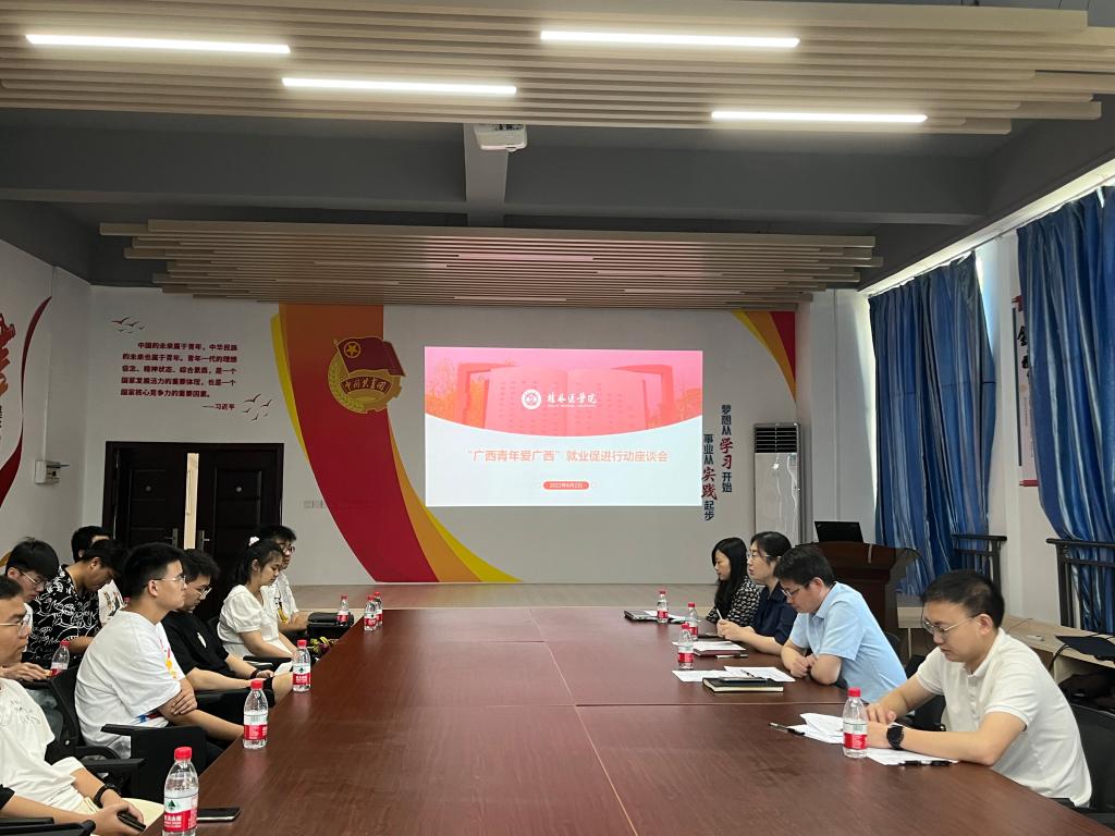 招生与就业服务指导中心周阳帆老师结合当前大学毕业生就业形势,从国家、自治区有关就业政策,学校近年留桂就业情况等方面进行了详细解读。随后,校团委实践部陶光均老师对共青团广西区委“广西青年爱广西”就业促进行动的“1+10”帮扶行动进行了详细介绍。参会学生代表一一就个人当前的学习状况、就业想法做了交流。