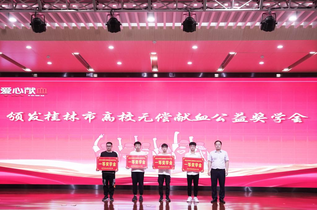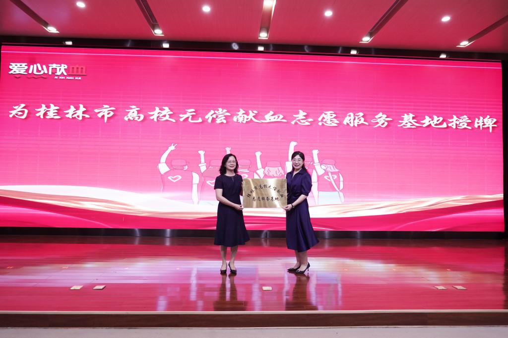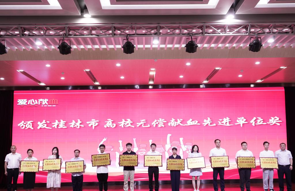 随后,市委宣传部常务副部长诸葛亚为我校颁授桂林市高校无偿献血志愿服务基地牌匾。市卫健委党组书记、主任蒋平华为桂林市高校无偿献血志愿者队伍授旗。与会嘉宾分别为获得“桂林市高校无偿献血奉献奖”、“桂林市高校无偿献血先进个人”、“桂林市高校无偿献血公益奖学金”、“桂林市高校无偿献血先进单位”的个人和集体颁奖。