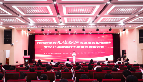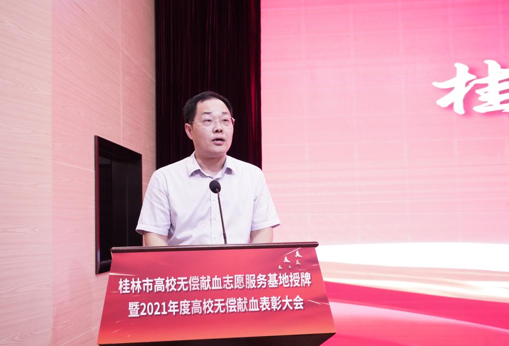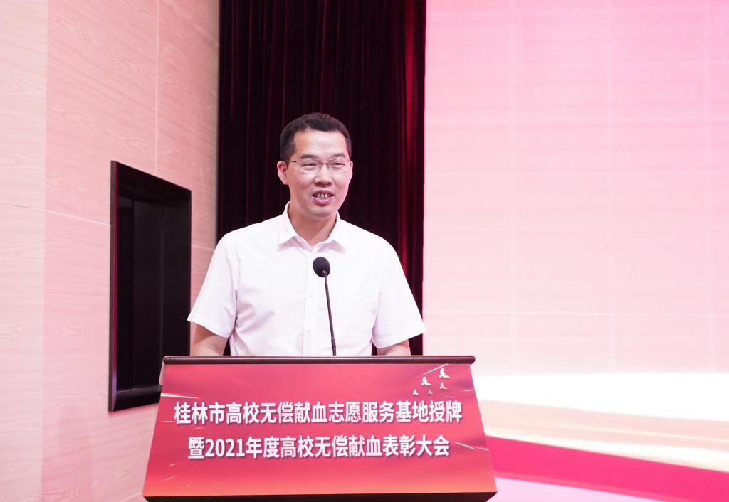 7月13日上午,由桂林市献血委员会主办,桂林市红十字会协办,桂林市中心血站和我校承办的“桂林市高校无偿献血志愿服务基地授牌暨2021年度高校无偿献血表彰大会”在临桂校区多功能报告厅隆重举行。桂林市副市长、市献血委员会主任龙杏华,学校副校长、组织部部长马献力出席活动并讲话。市献血委员会、学校有关部门负责人及桂林市各高校代表参加了活动。