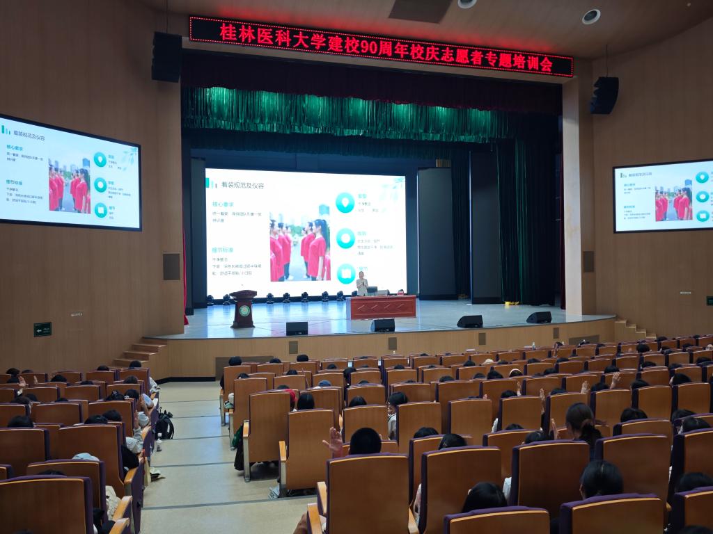 校团委精心策划培训内容,涵盖校史校情、服务规范、文明礼仪及应急救护等关键领域。培训会上,学校党委宣传部副部长金罗成首先为志愿者们作了校史校情专题报告。他回顾学校九十载栉风沐雨、砥砺前行的光辉历程,生动讲述了学校在人才培养、科学研究、社会服务等方面取得的卓越成就。随后,第一附属医院团委书记王彦妮围绕志愿者服务规范和文明礼仪进行专业指导。她结合大型活动服务经验,从仪容仪表、言行举止、沟通技巧、突发事件应对等方面进行了详细讲解和示范,强调志愿者是学校形象名片,其专业、规范、热情的服务至关重要。为保障校庆活动期间的公共安全,提升志愿者应对突发状况的能力,本次培训特别邀请了桂林市红十字会的专业培训师周华英进行应急救护技能培训。培训团队通过理论讲解与模拟操作相结合的方式,重点传授了心肺复苏(CPR)、自动体外除颤器(AED)使用、海氏急救法和创伤包扎等常用急救知识和技能。