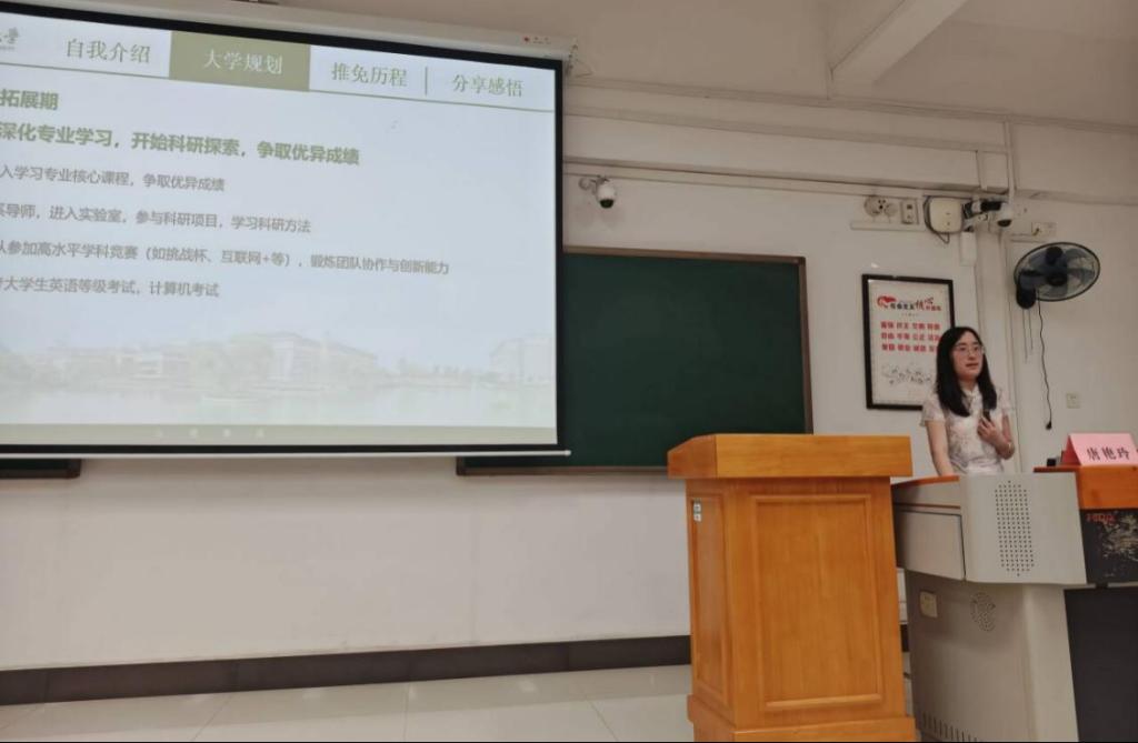 黄雨欣以“以勤筑学,以行践知”为题,结合预防医学专业培养特点,系统拆解各阶段学习重点。她强调,预防医学学生应尽早构建知识体系,重视专业核心课程与英语积累,并分享了通过思维导图整合知识、参与科研及学科竞赛的实践路径。唐艳玲则聚焦四年制专业节奏,以“行远自迩,笃行不怠”为主题,将大学划分为“适应探索”“深耕拓展”“冲刺提升”“抉择未来”四个阶段。作为专业第一,她指出四年制学生需在有限时间内高效平衡学业与科研,精准把握研究生推免核心要求。现场互动热烈,同学们围绕学业规划、研究生推免等踊跃提问。两位学姐耐心解答,并留下联系方式持续提供指导。