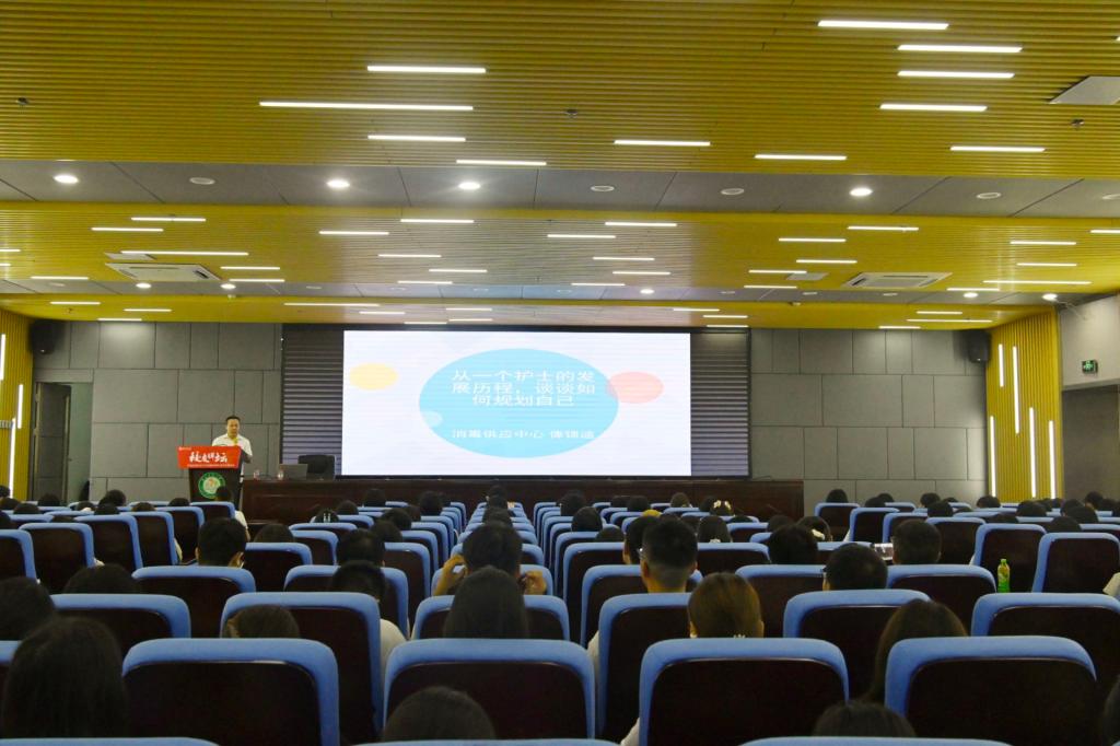 俸锦迪以“从一名护士的发展历程,谈谈如何规划自己”为题,以自身经历作为切入点,通过故事化叙述,用幽默风趣的语言分享了作为一名手术室护士、作为医院对口扶贫村第一书记、作为援尼日尔医疗队队员时的不同的动人经历和故事,在座师生从他的身上看到了一名桂医人对“弘德善医”校训的生动实践。最后,他激励同学们要树立正确的择业观和就业观,要将个人理想的实现与社会的需要、国家的发展同频共振,努力实现自己的人生价值,展现青年一代的责任与担当。