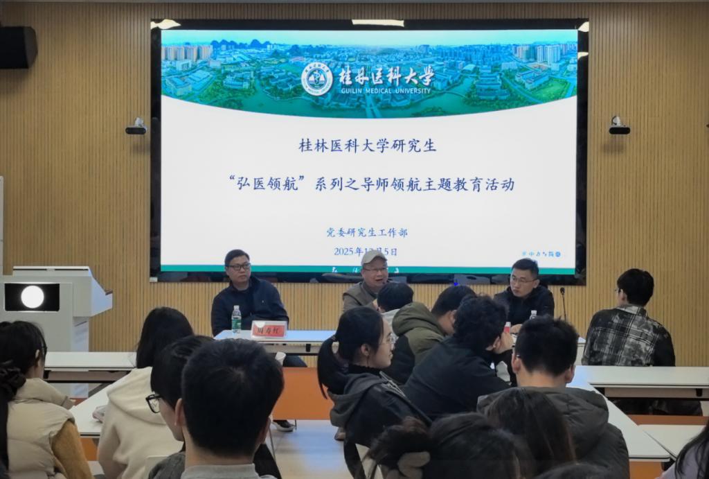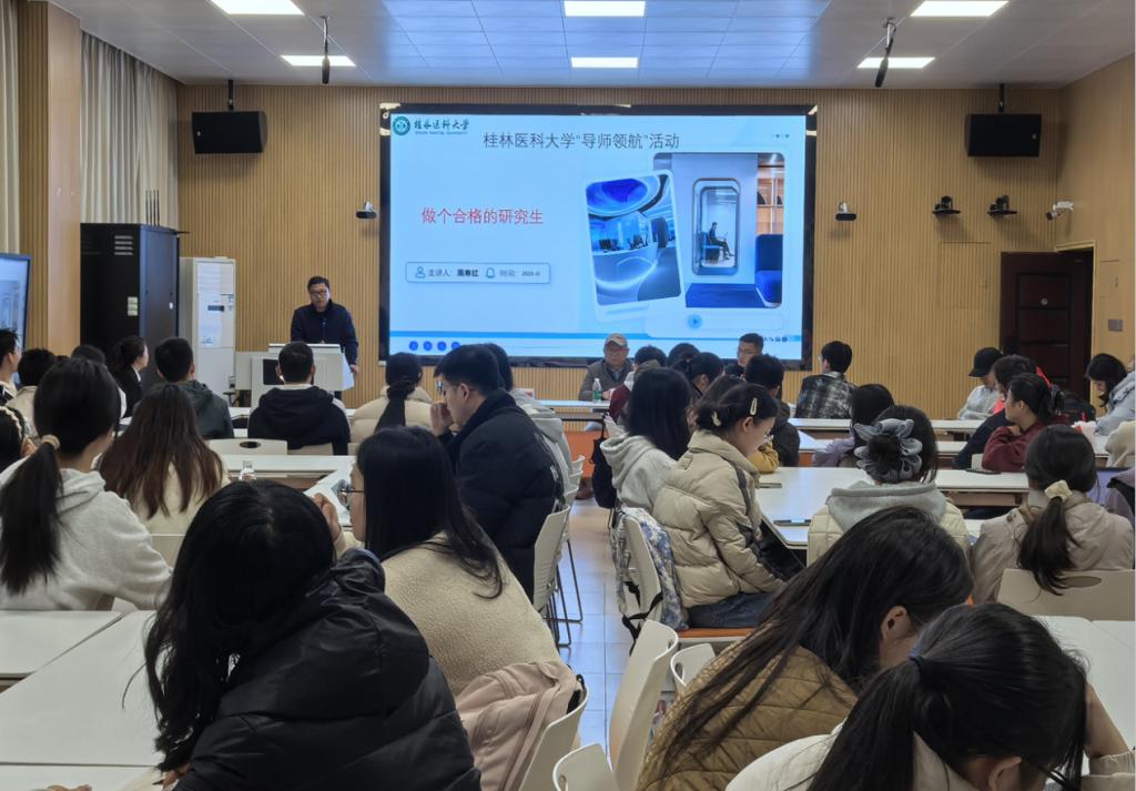 为扎实推进我校研究生学风建设,全面提升研究生科研核心素养与职业发展规划能力,12月5日,党委研究生工作部在临桂校区药学楼2108智慧教室开展“弘医领航”系列主题教育活动之导师领航活动。活动邀请党委研究生工作部副部长谢伟全、基础医学院周寿红教授(校优秀研究生导师获得者)、公共卫生学院韩菲老师主讲,党委研究生工作部全体教师以及六十余名研究生代表参与活动。