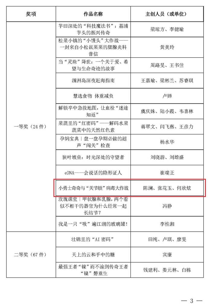 近日,第三届广西网络科普作品创作大赛结果揭晓。我院2023级医学检验技术专业陈澜、张花玉、何欣炫同学,凭借原创科普童话《小勇士奇奇与“关节锁”病毒大作战》,从3416件作品中脱颖而出,斩获一等奖!