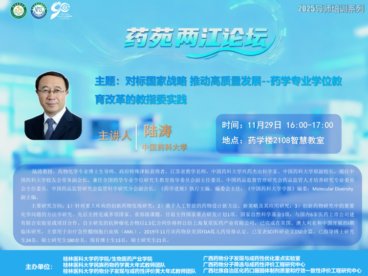 【来源:【建校90周年学术活动】中国药科大学陆涛教授讲座通知 | 发布日期:2025-11-27 】